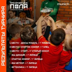 Воспитанники тренера Анатолия Соломахина стали победителями турнира "Тренировочные поля" среди мальчиков 2019г.р. турнир проходил в ФОК "Молодежный" п. Отрадное Воронежской области. в турнире участвовало 7 команд из Ельца,Липецка, Старого Оскола. Поздравляем наших юных футболистов!